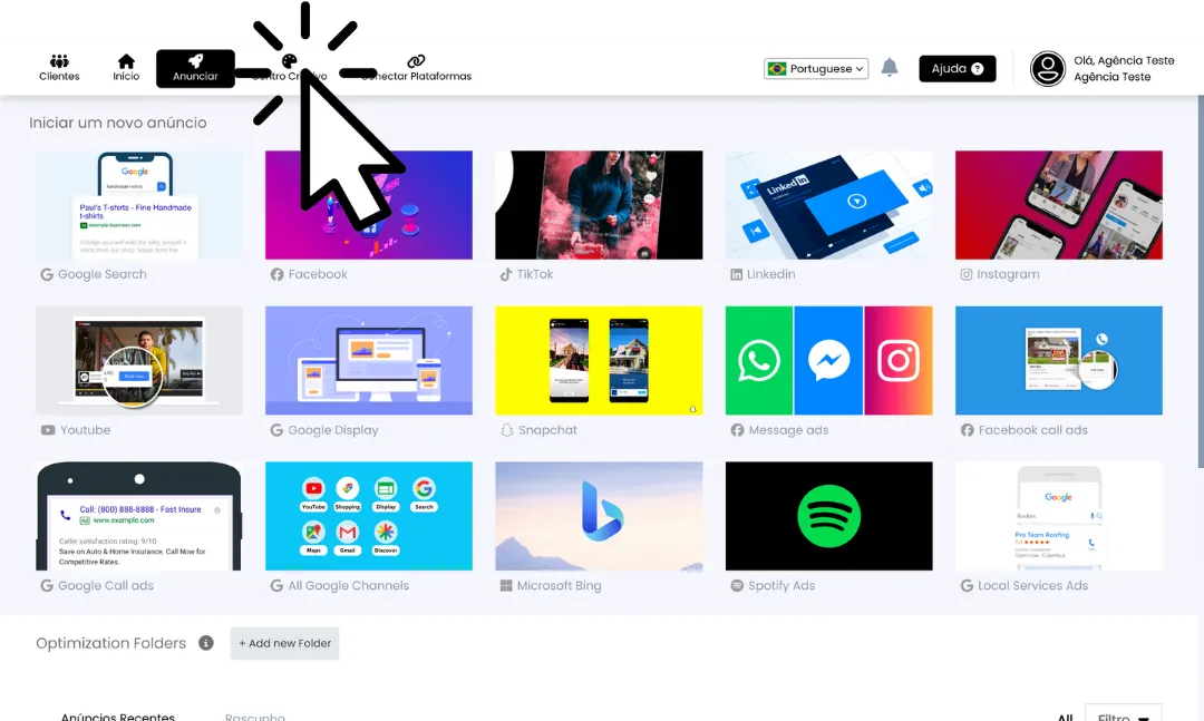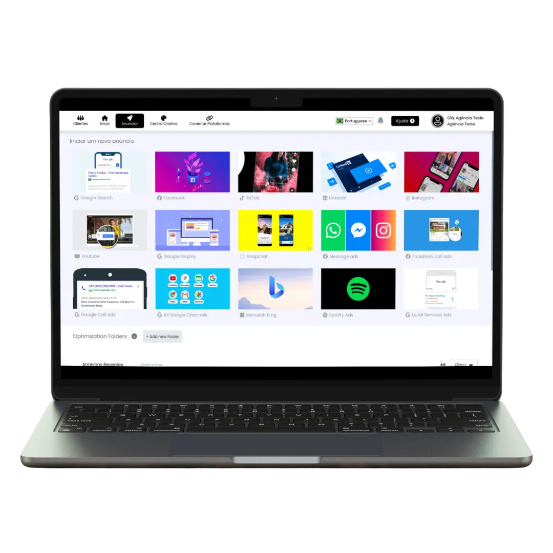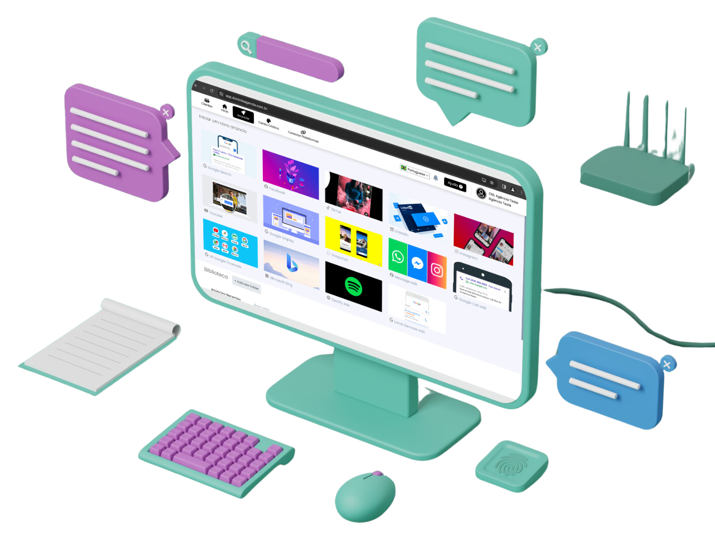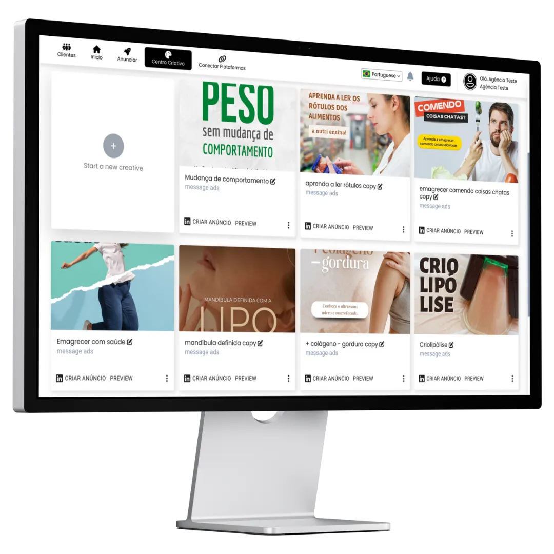 Crie anúncios de forma simples e prática em todas as plataformas, tudo em um só lugar. Nossa ferramenta integrada permite que você gerencie campanhas no Instagram, Facebook, Google, LinkedIn, TikTok e muito mais, com facilidade e eficiência.