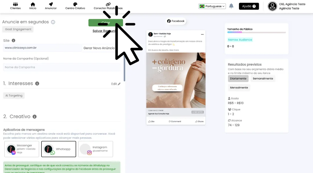 Crie anúncios rapidamente utilizando nossa inteligência artificial que cria campanhas para você em segundos. Você também terá modelos prontos que nossa equipe cria para você.